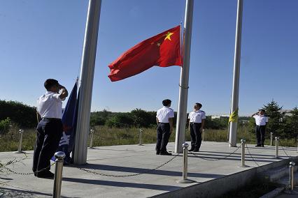伴隨著廣播介紹大連海事大學(xué)與錦州航星集團(tuán)校企合作的深厚情誼,我們?nèi)嗪图瘓F(tuán)所有員工已經(jīng)整齊的站在了國(guó)旗前,等待著國(guó)旗升起的莊嚴(yán)時(shí)刻。